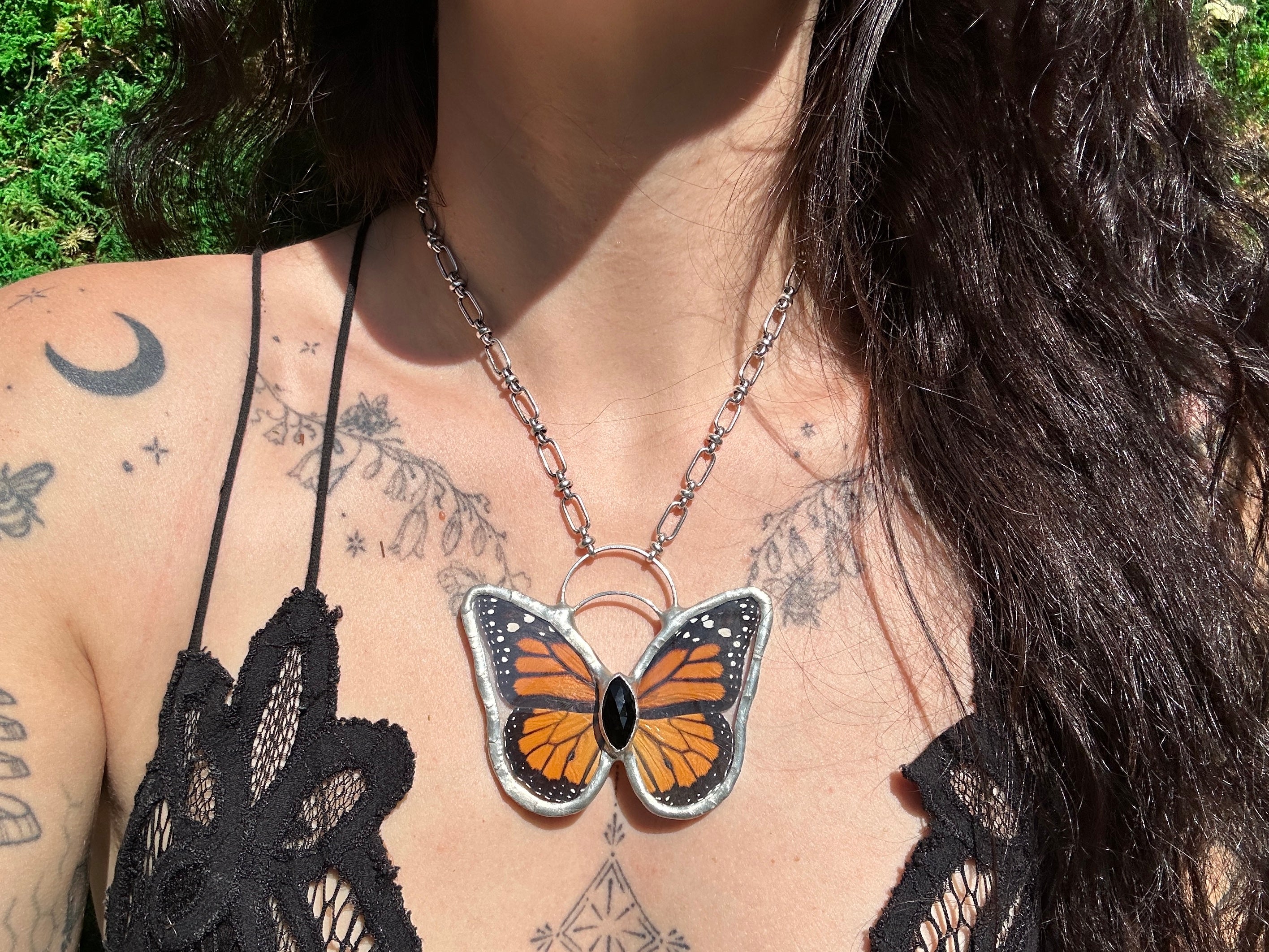 The Onyx necklace features the iconic Monarch butterfly wings, paired with the deep, glossy beauty of an Obsidian gemstone. Symbolizing transformation and resilience, these elements come together in a design that is both striking and timeless. Handcrafted with care and finished with silver framing, this piece is a celebration of nature’s enduring strength and artistry.