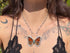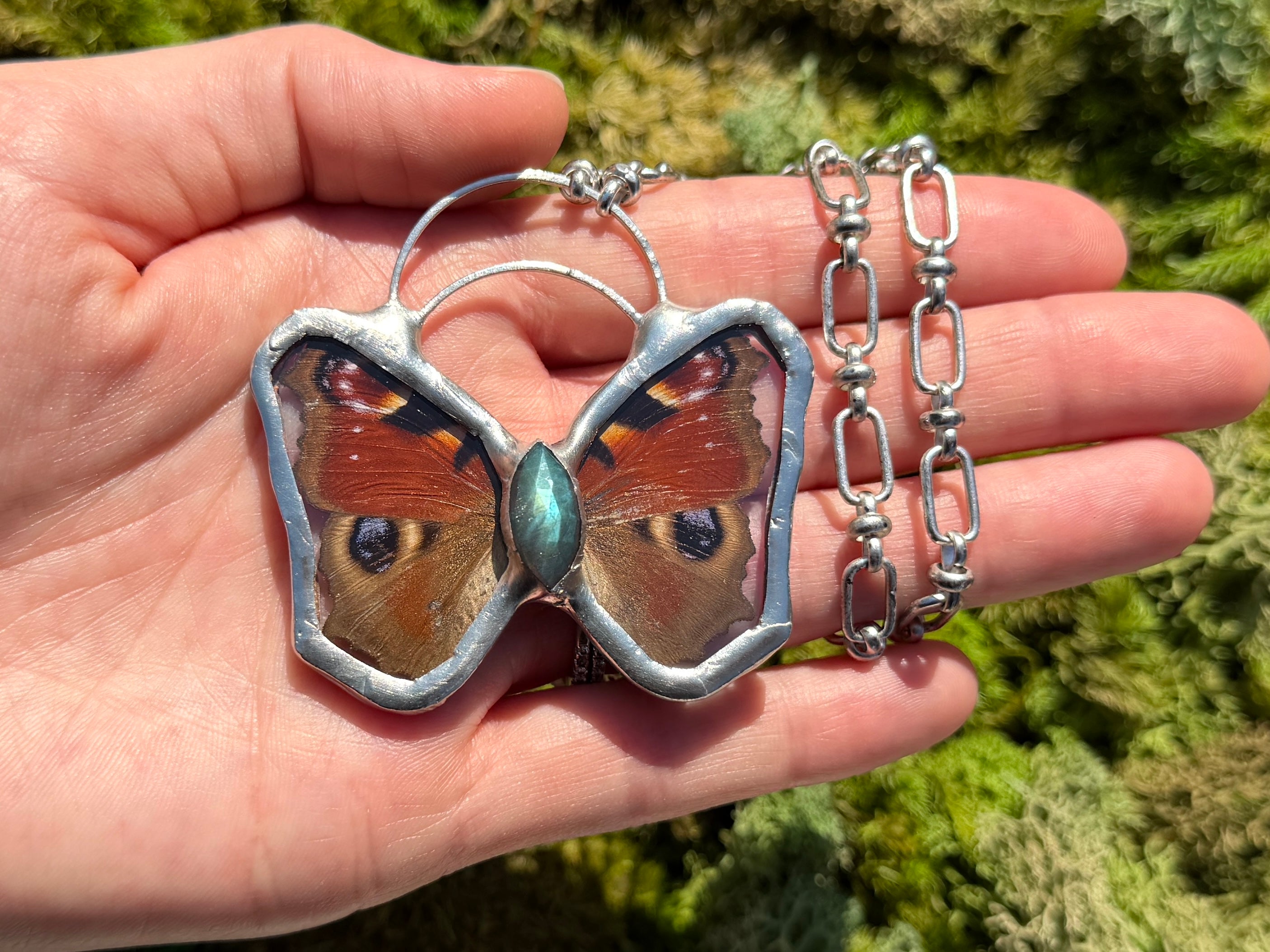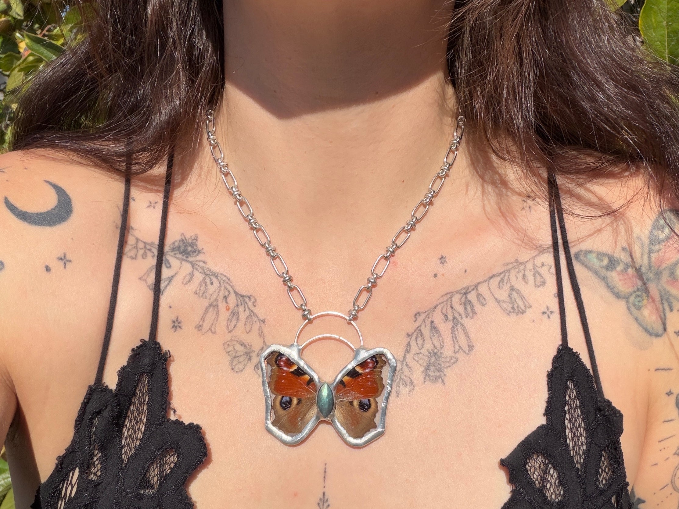 The Bright Eyes necklace features the magnificent wings of the Inachis Io Buckeye butterfly paired with a shimmering labradorite gemstone. This handcrafted piece is completed with an antique style silver plated chain, radiating a harmonious blend of natural charm and sophisticated artistry.