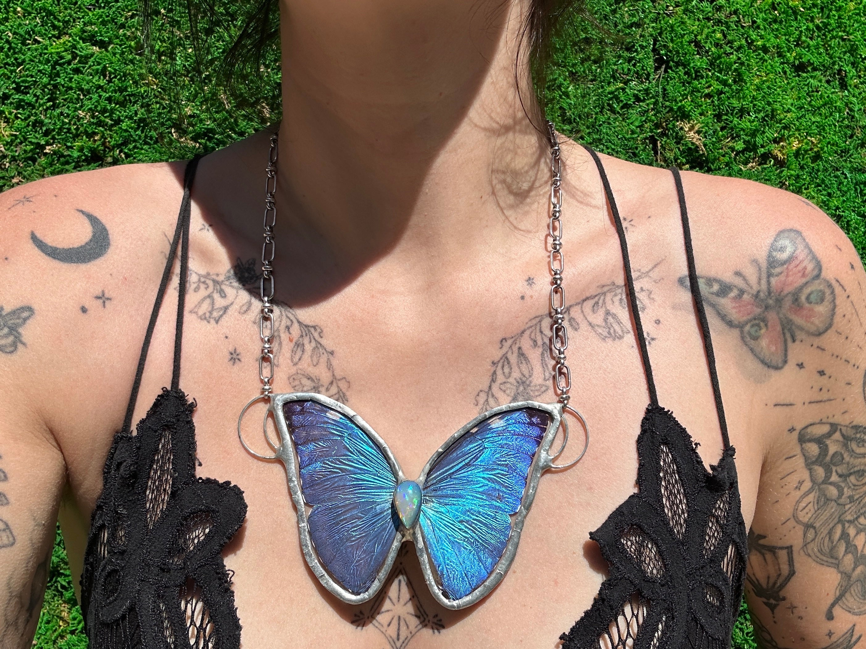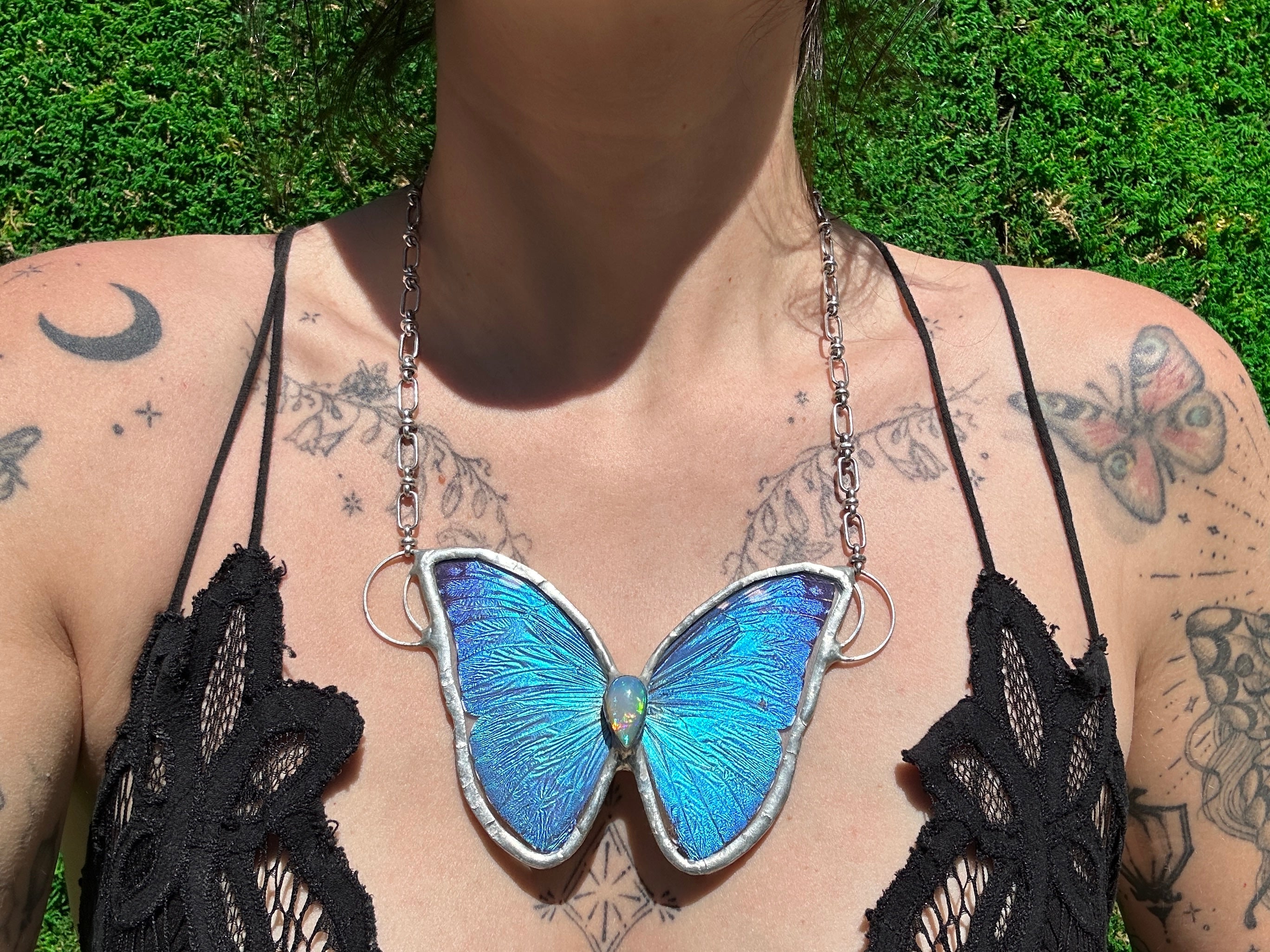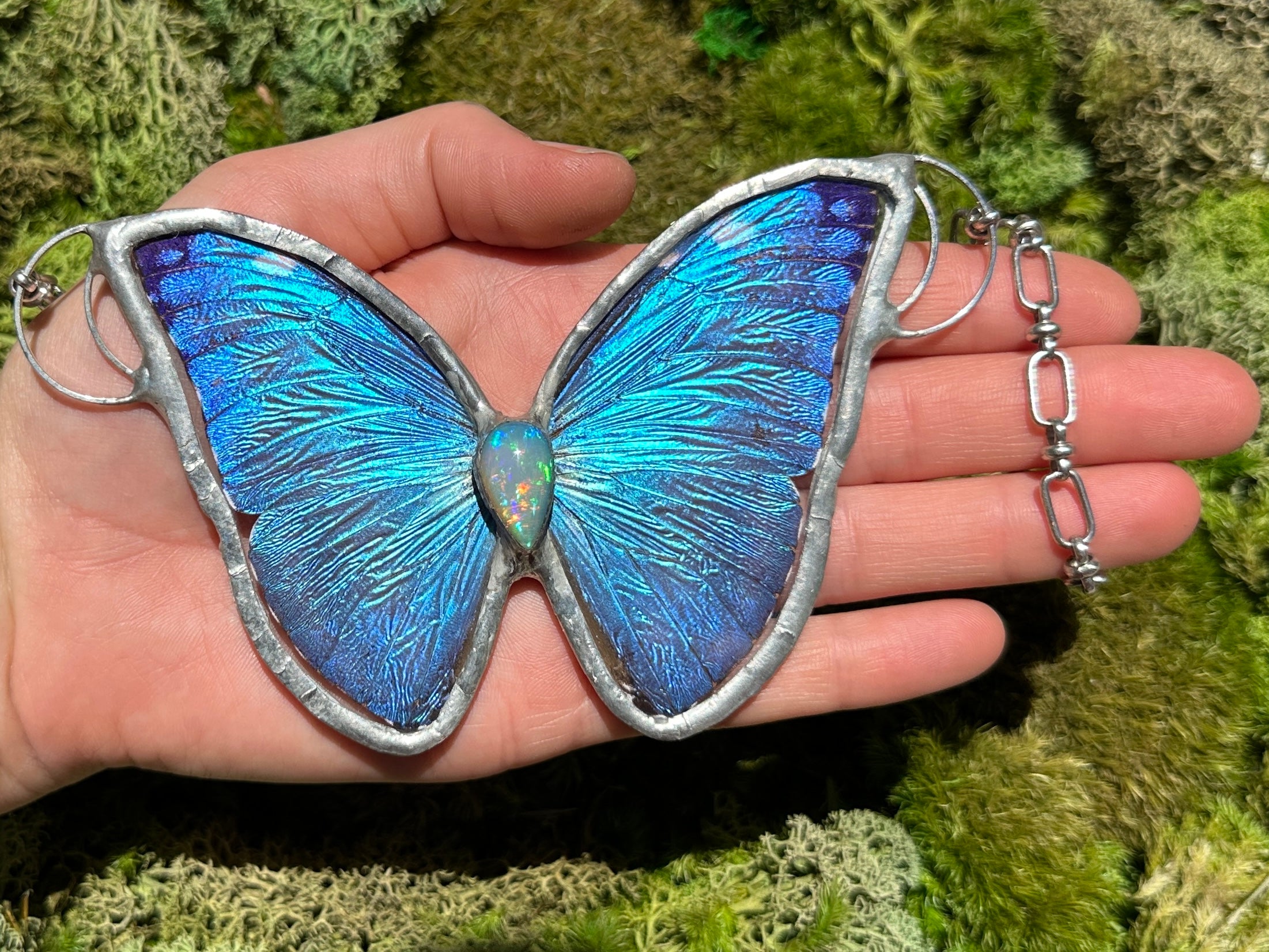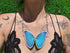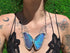 The Super Nova Necklace showcases the vivid wings of the Blue Peruvian Morpho Marcus Adonis butterfly, paired with the glowing elegance of an Ethiopian opal gemstone. Handcrafted with care, this timeless piece is finished with Silver framing, blending the bold brilliance of butterfly wings with the serene charm of opal.